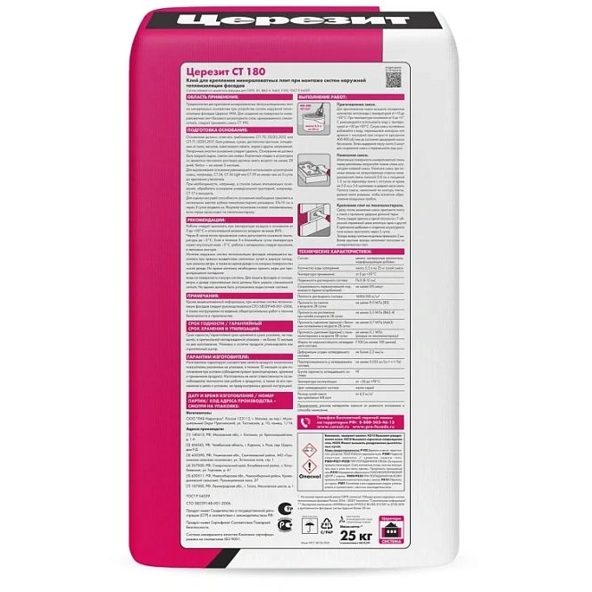 Клеевая смесь Ceresit CT 180 предназначена для крепления минераловатных теплоизоляционных плит на минеральных основаниях при устройстве систем наружной теплоизоляции фасадов Ceresit WM.